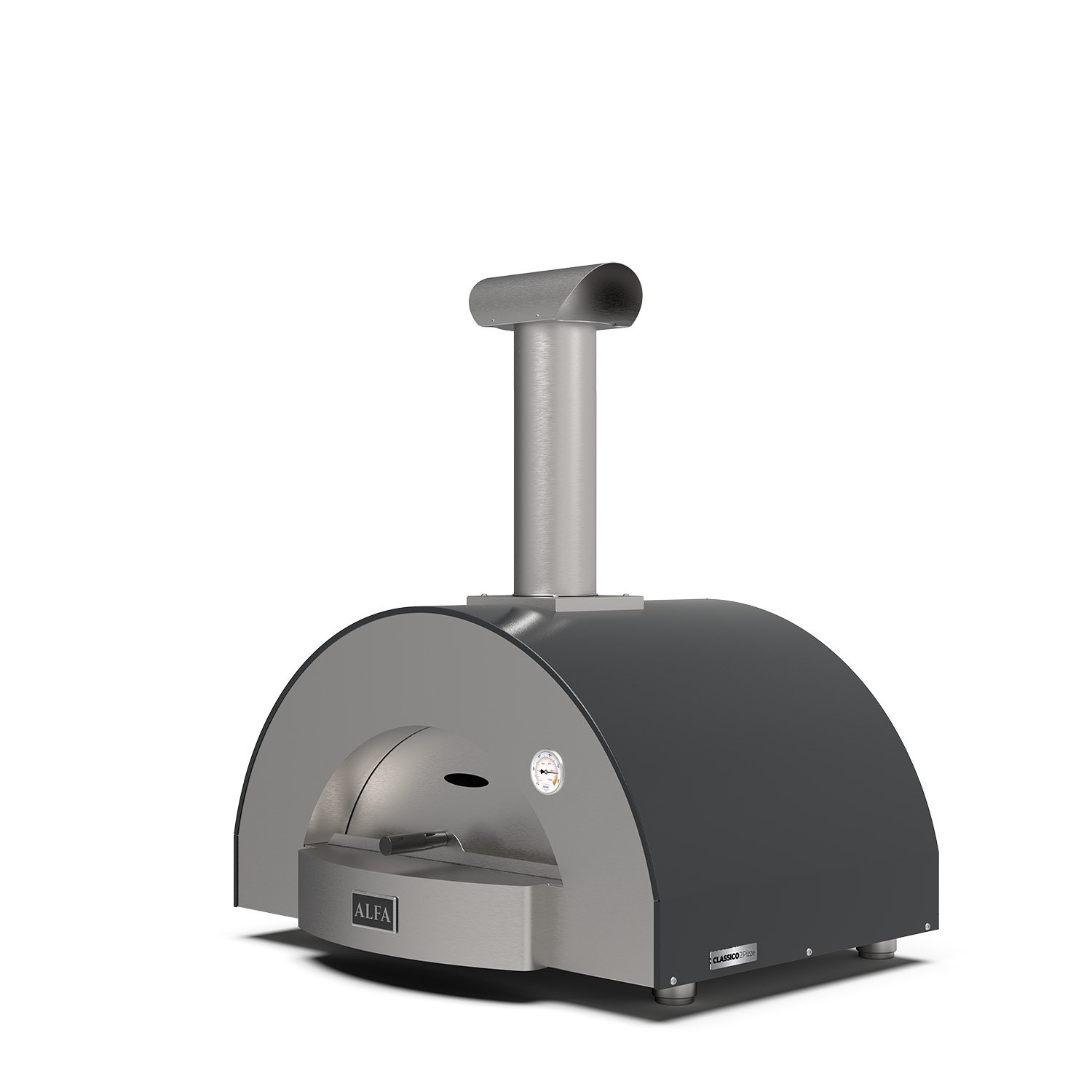 The Alfa Classico 2 Pizze Countertop Pizza Oven combines Italian design with innovative Forninox Technology, blending stainless steel with refractory firebrick for outstanding performance. Its stainless dome heats quickly and evenly, while ceramic fiber insulation locks in heat for longer cooking sessions. With a 480 sq. in. refractory cooking floor, this oven is ideal for pizzas, bread, and more. Enjoy consistent results, efficient fuel use, and authentic wood-fired flavor with Alfa’s craftsmanship.