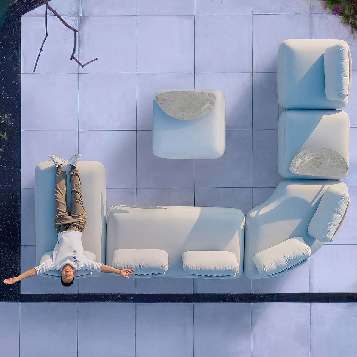The Couture Jardin OLALA Curved Corner Sofa, available at The Outdoor Store, combines luxurious comfort with modern sophistication. Its gracefully curved silhouette creates an inviting setting, perfect for lounging or entertaining in style. Designed for outdoor living yet elegant enough for indoor spaces, this piece effortlessly blends versatility and relaxation. Built with a contract-grade welded aluminum frame and finished with Tiger brand powder coating, the OLALA Curved Corner Sofa provides superior strength and long-term durability. The UV-treated outdoor cord and high-density foam cushions enhance comfort, while the COUTUREtex waterproof-treated fabric ensures resistance against the elements, maintaining its beauty season after season.