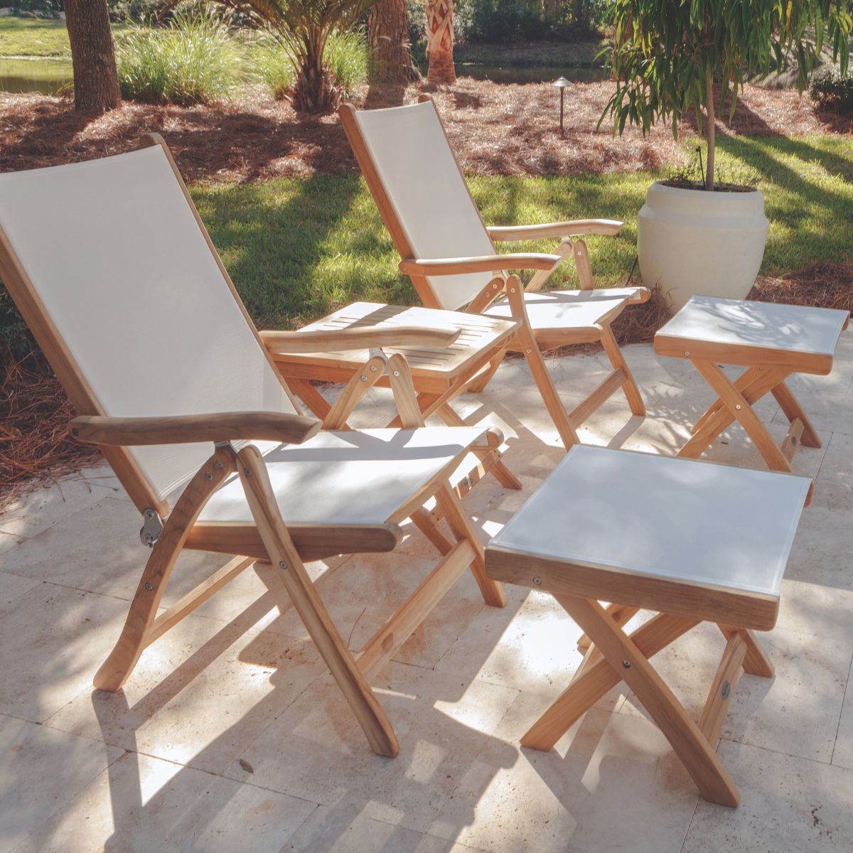 This high-back sling chair reclines to five positions, making it perfect for both upright dining and relaxed lounging. Arriving pre-assembled, this sling footrest is ready for immediate use. Over time, teak develops a graceful silver patina if left untreated. This versatile piece is also offered in black, gray, moss, and navy finishes.